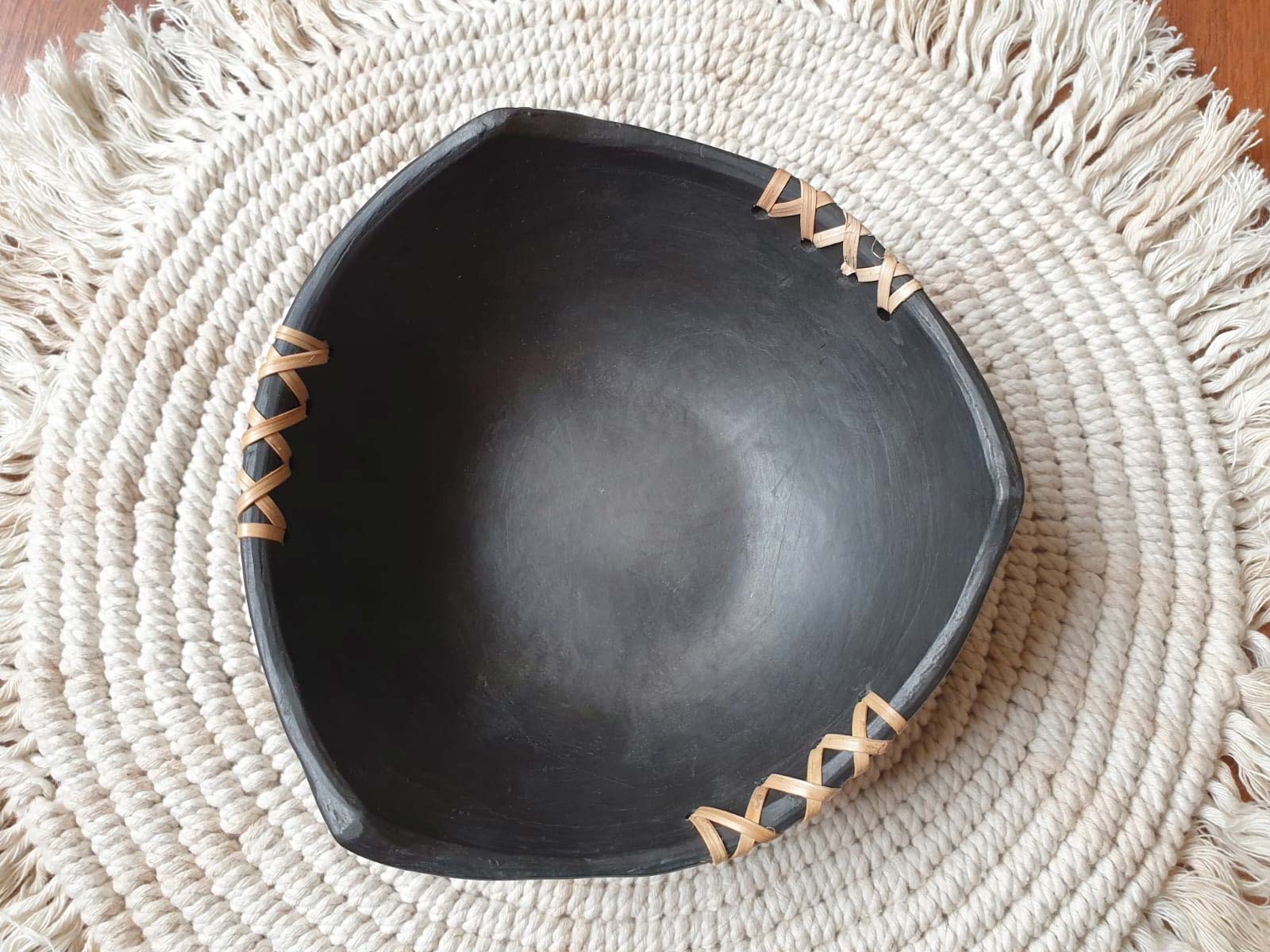 Add a touch of rustic artistry to your space with the Trine Stitch Bowl. This handcrafted black stoneware piece features a soft triangular shape with rounded edges. Moreover, the natural twine stitches across its surface create a striking contrast with the smooth matte finish. It rests on a woven base, which adds warmth and texture to your setting. Therefore, it enhances both modern and traditional interiors with ease.